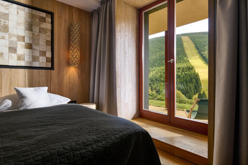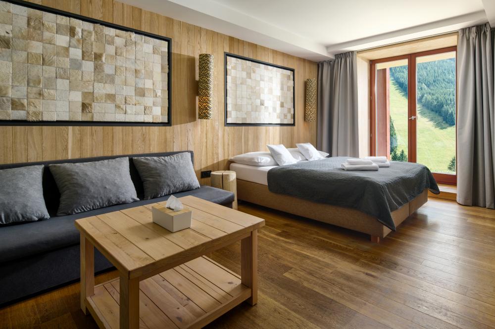 Možno dokupit až dva dodatkowe łóżka do tego typu apartamentu. Apartament znajduje się na parterze hotelu i ma własny taras z widokiem na stok Stoh. Całkowita powierzchnia apartamentu wynosi 30 m2. Luksusowe meble z pewnością zadowolą nawet najbardziej wymagających klientów. W wyposażeniu pokoju znajduje się prywatna łazienka z prysznicem, umywalką, WC i suszarką do włosów, oraz szafa, sejf, lodówka i