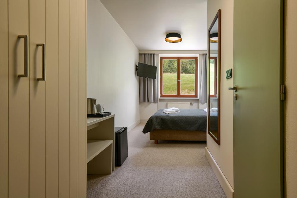 Pokój jest przeznaczony dla maksymalnie 4 osób i oferuje piękny widok na dolinę Karkonoszy. Można zamówić do dwóch dodatkowych łóżek do tego typu pokoju. Do dyspozycji jest rozkładana sofa, która po rozłożeniu odpowiada rozmiarowi standardowego łóżka. W łazience znajduje się prysznic, umywalka, toaleta i suszarka do włosów. Do przechowywania Państwa rzeczy dostępna jest szafa, a dla Państwa wygody pokój jest