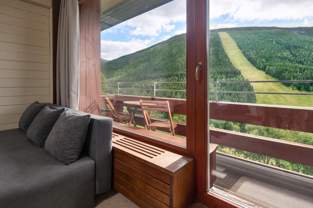 Można zamówić do dwóch dodatkowych łóżek do tego typu pokoju. Przestronniejszy pokój w porównaniu do pokoju Standard ma większą łazienkę z prysznicem, umywalką, toaletą i suszarką do włosów. Do przechowywania Państwa rzeczy dostępna jest szafa, a dla Państwa wygody pokój jest również wyposażony w sejf, lodówkę i telewizję satelitarną. Dużym atutem jest balkon z widokiem na dolinę Karkonoszy.
